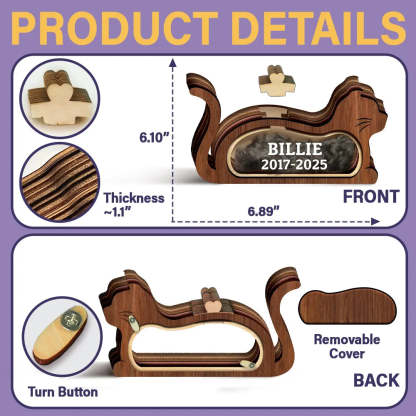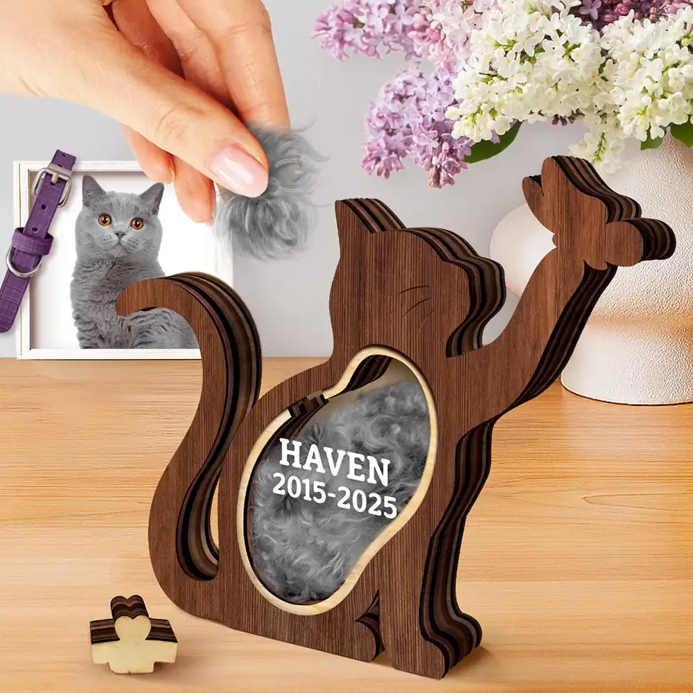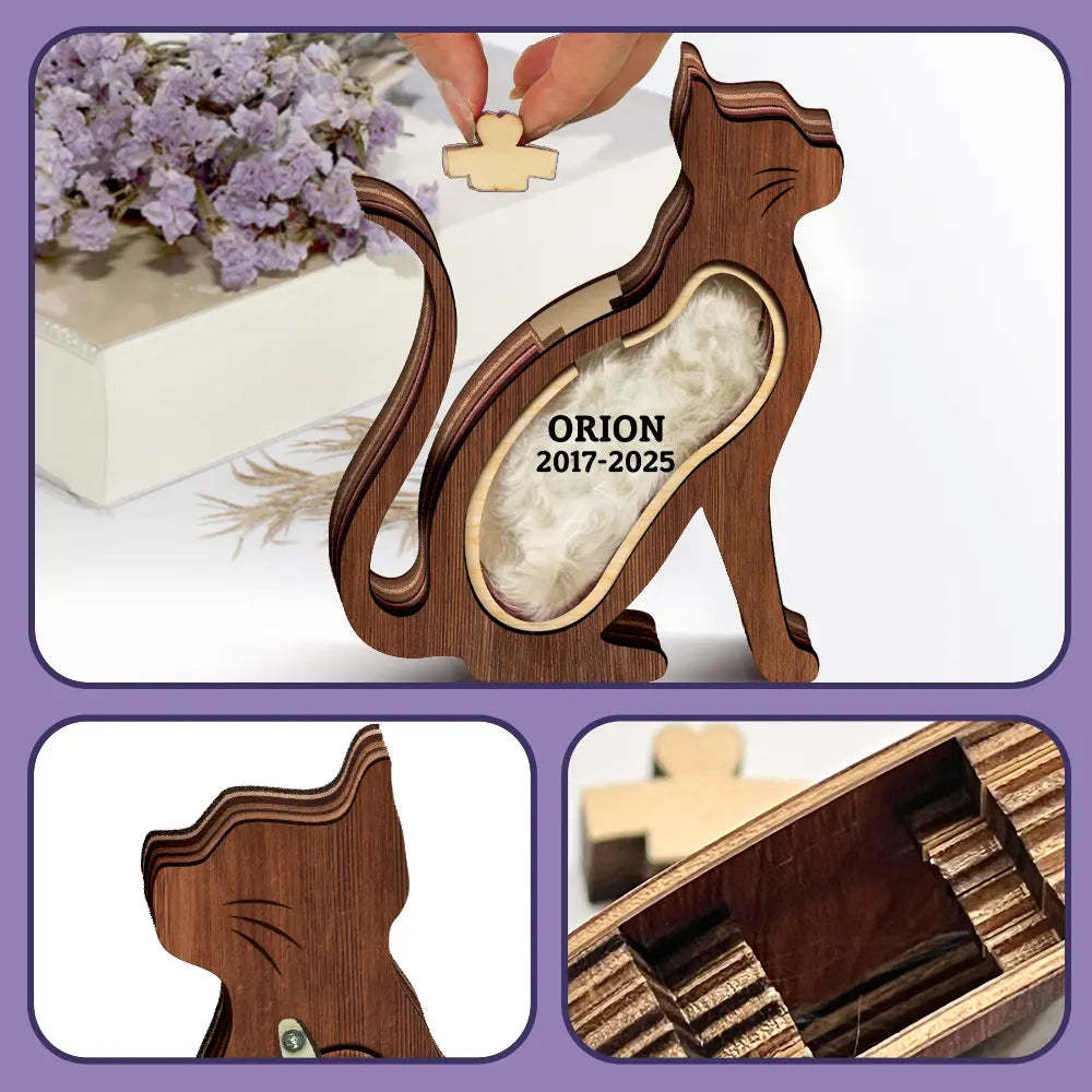 Handcrafted with care, this wooden keepsake allows you to preserve a lock of fur or a cherished memento. Its cat-shaped design and custom engraving make it a unique and thoughtful tribute to your beloved feline companion, honoring their memory with timeless grace.