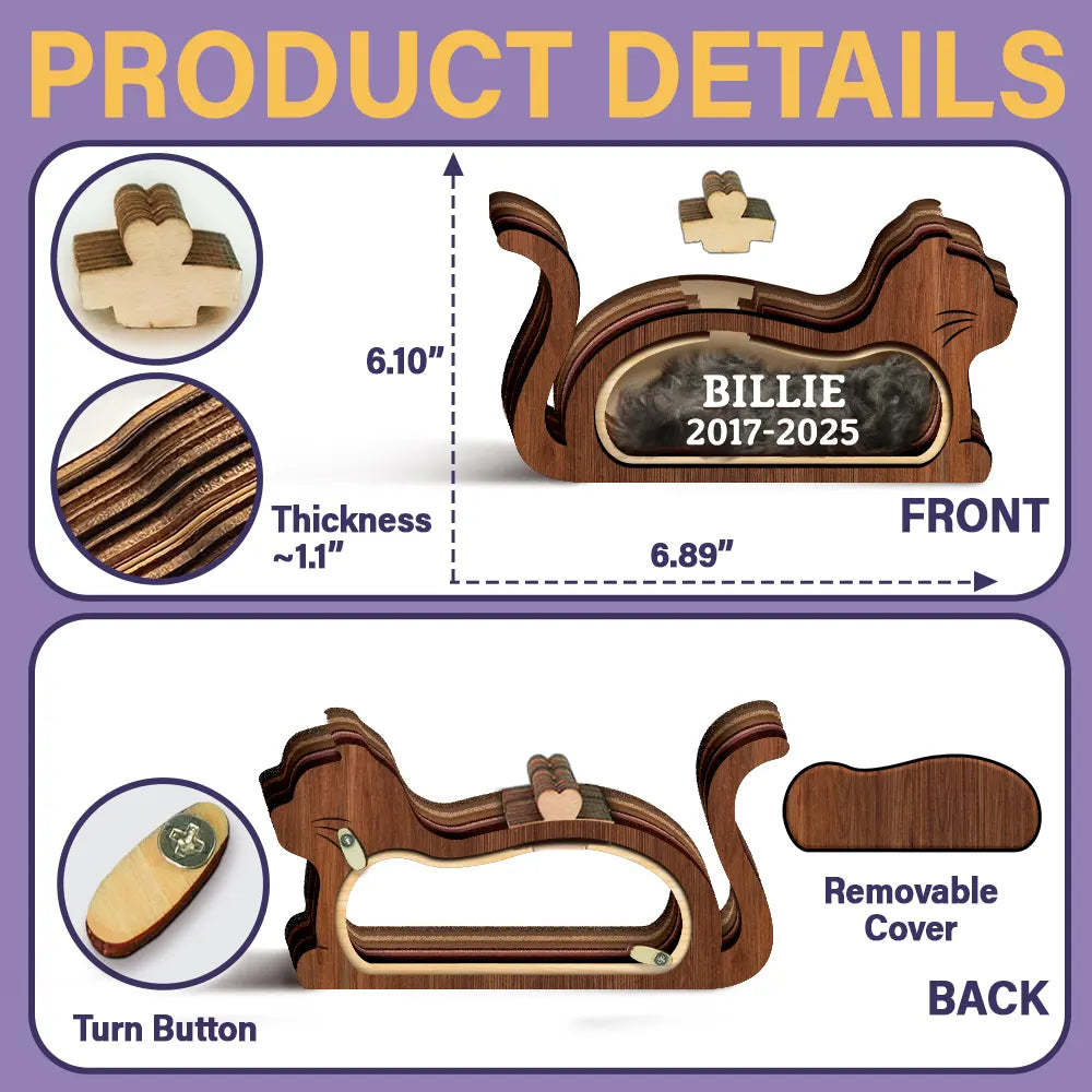 - Secure closure - Features a removable cover secured with a turn button, keeping your cat’s precious memories safe. The six-layer design with removable stoppers and hollowed inner layers offers a secure space for storing fur or tiny keepsakes.