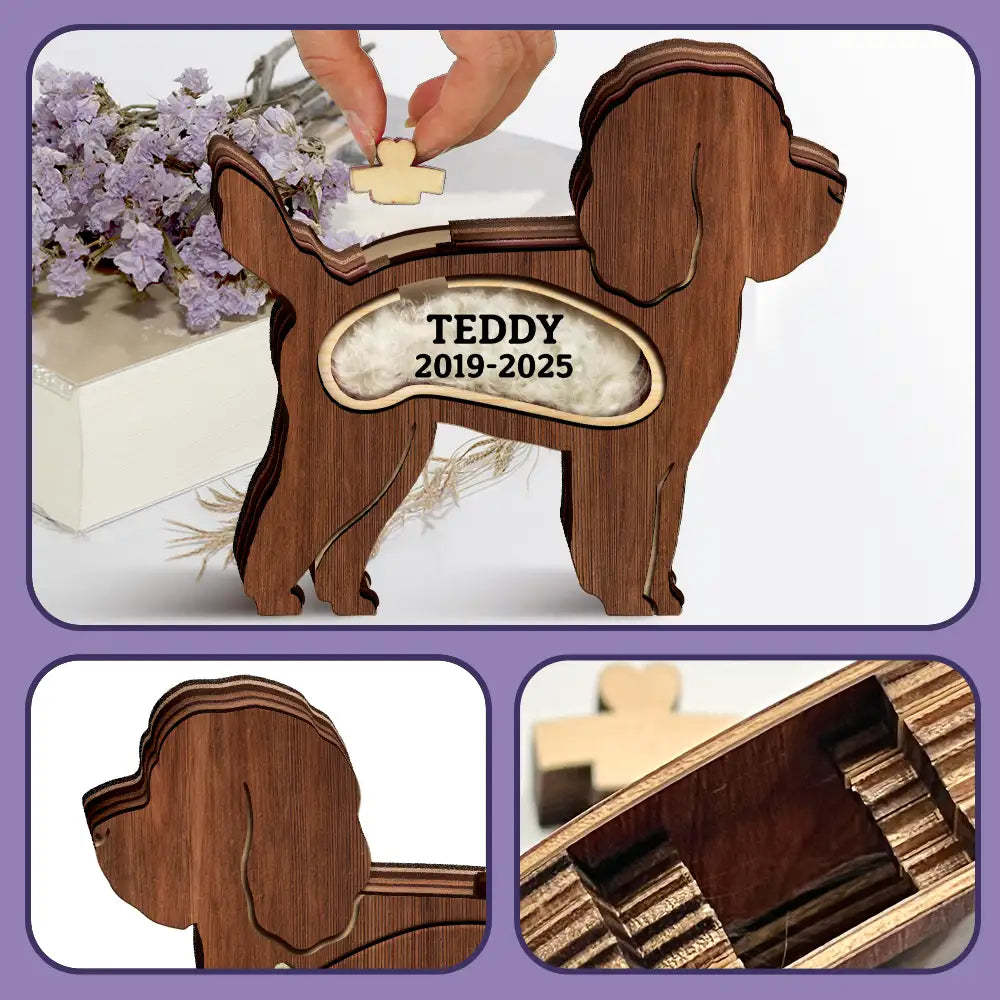 Celebrate the bond with your furry friend through our Pet-Shaped Wooden Keepsake, thoughtfully designed to preserve memories that matter most. Crafted from polished wood with durable acrylic accents, each piece showcases natural textures that make it truly unique. The six-layer construction includes outer layers with removable stoppers and inner layers hollowed to securely hold fur, creating a personal and meaningful memento.